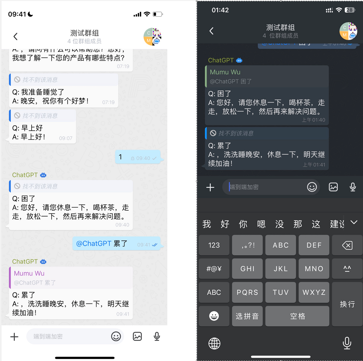 把ChatGPT Bot添加为群聊的成员,之后,只要在群里面@ChatGPT输入内容,ChatGPT就会引用提问者的问题,并将问题和答案发送至群内。