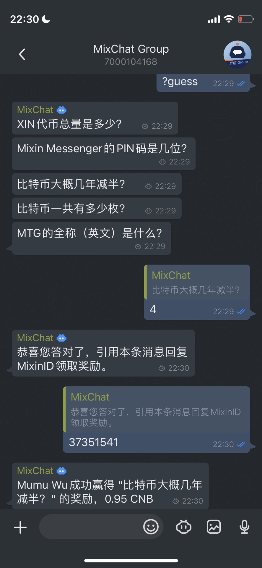 已经为:信用社(7000101782)、LOTO7的彩票站(7000104911)、玛丽的Mixin资讯屋(7000104821),分别投放了5个相同的问题,每题奖励100,000 CNB,方便大家体验。