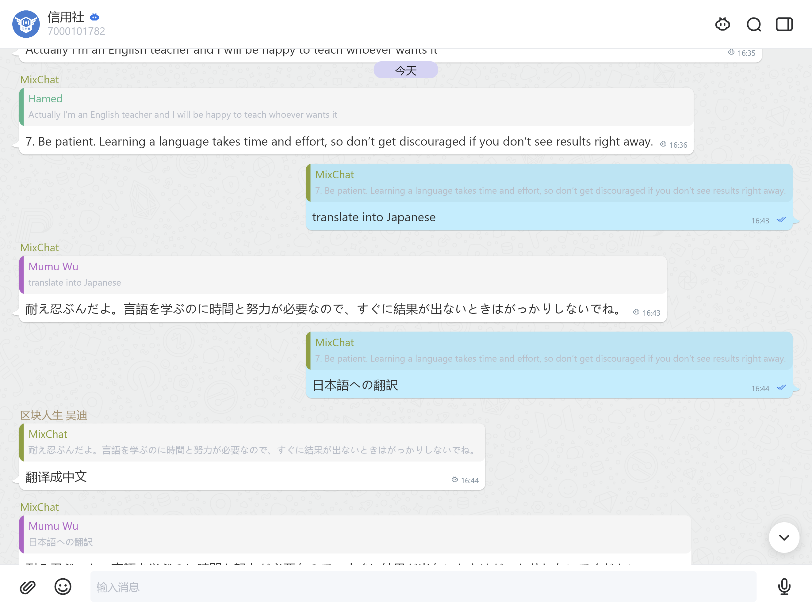 将MixChat的回复用英语、日语让其将英文翻译成日语,用中文让其将英文翻译成中文,支持各种语言之间的对话:
