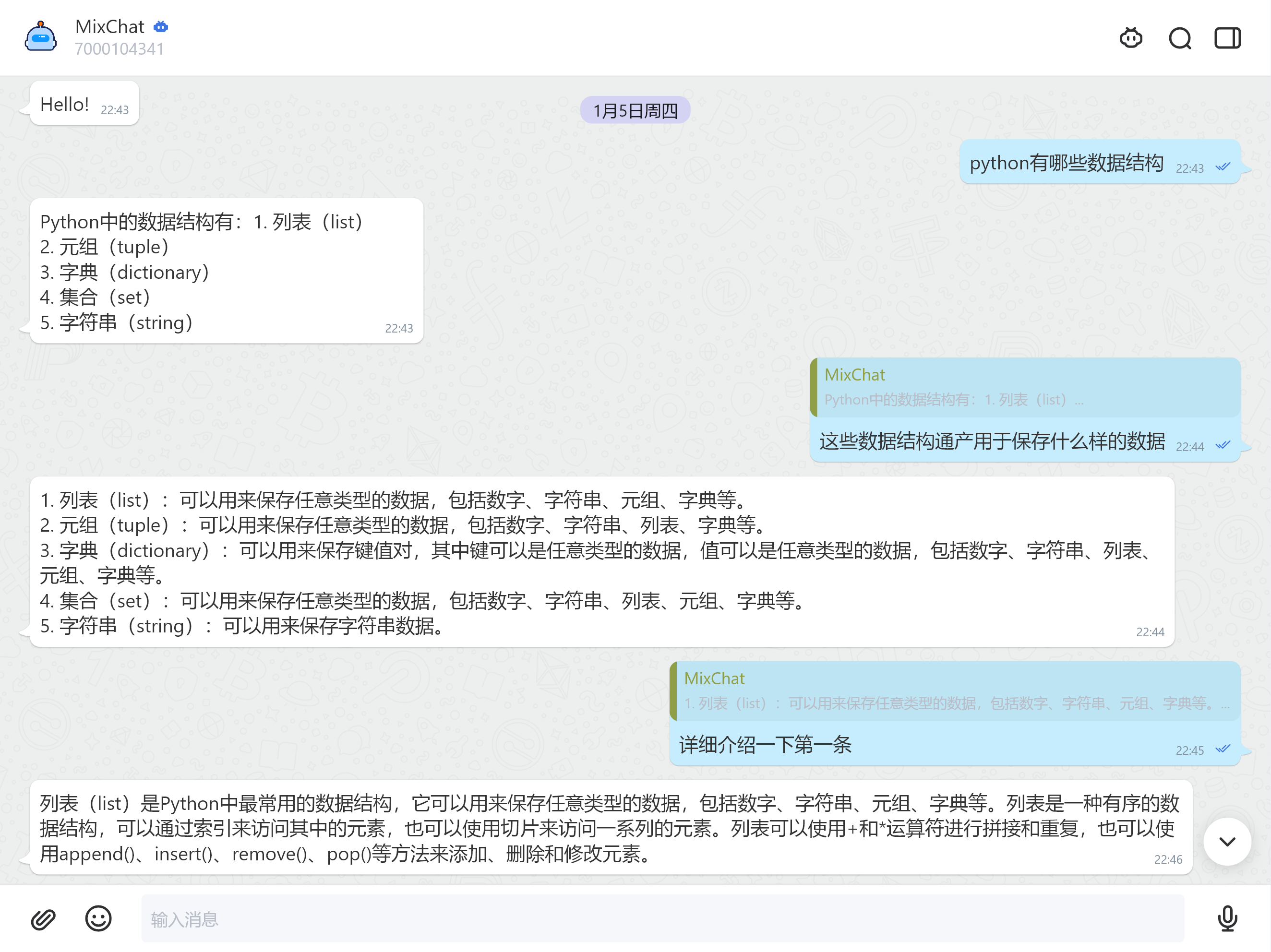 新增引用方式后,无论个人与MixChat对话还是超级群内与MixChat对话,可直接引用ChatGPT的回复进行进一步对话。