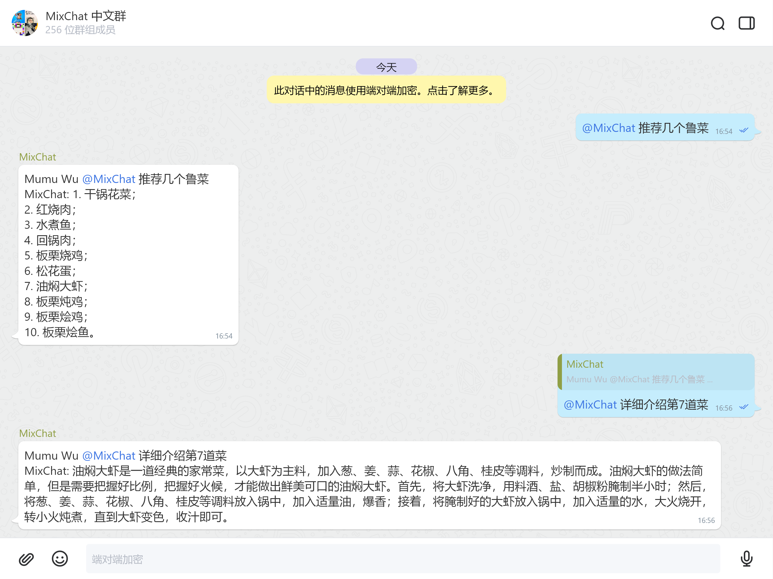 当前交互方式,个人用户可直接与MixChat对话,超级群用户需要在群中@MixChat后对话。