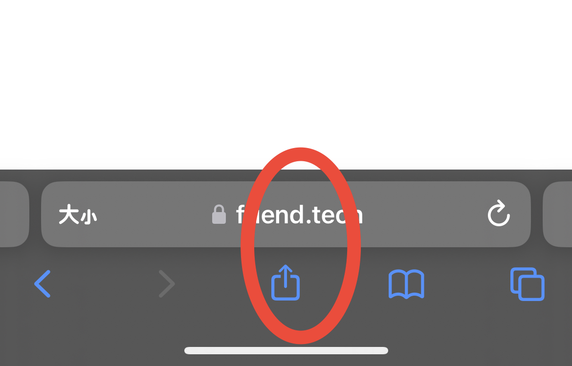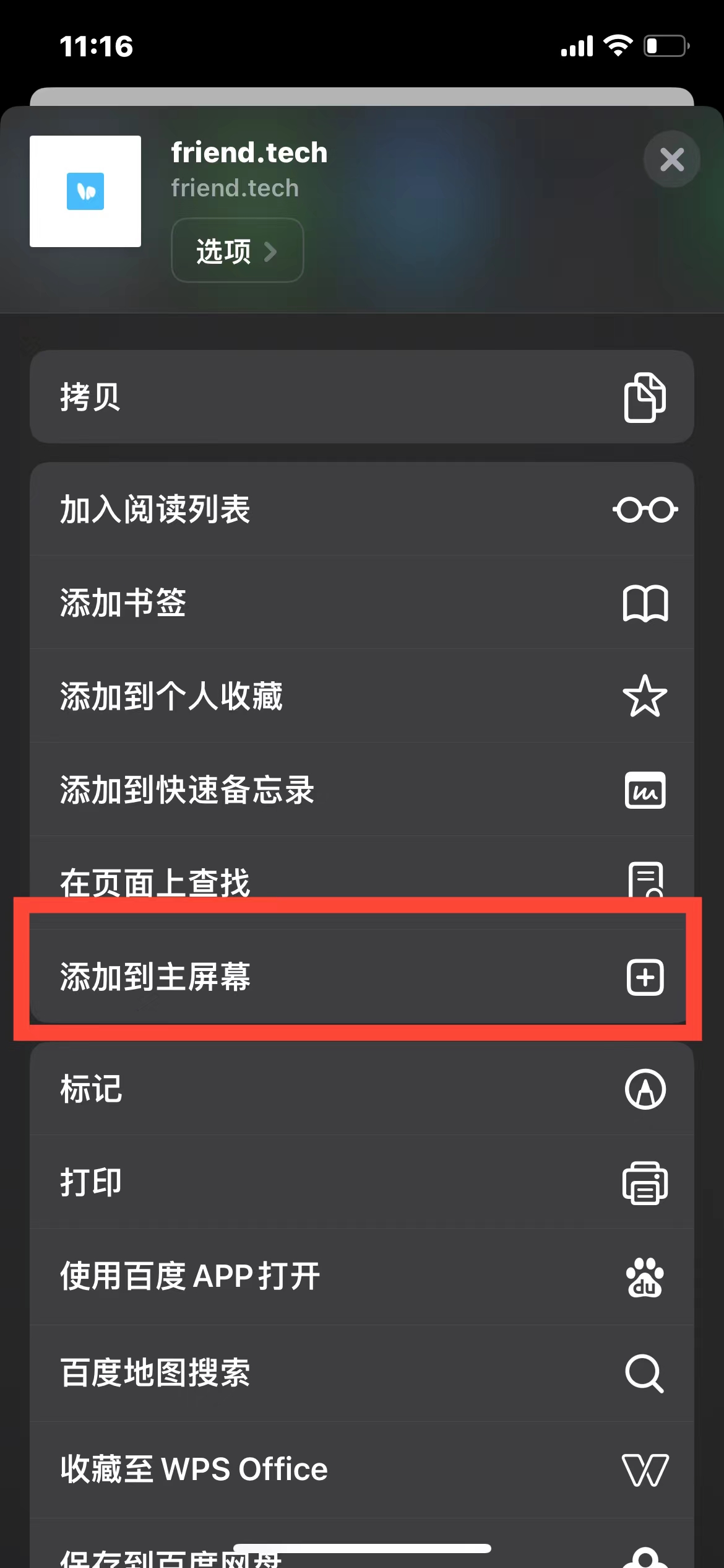 2、打开后输入friend.tech 链接,输入后选择下方的分享按钮,往下拉,可以看到添加主屏幕。