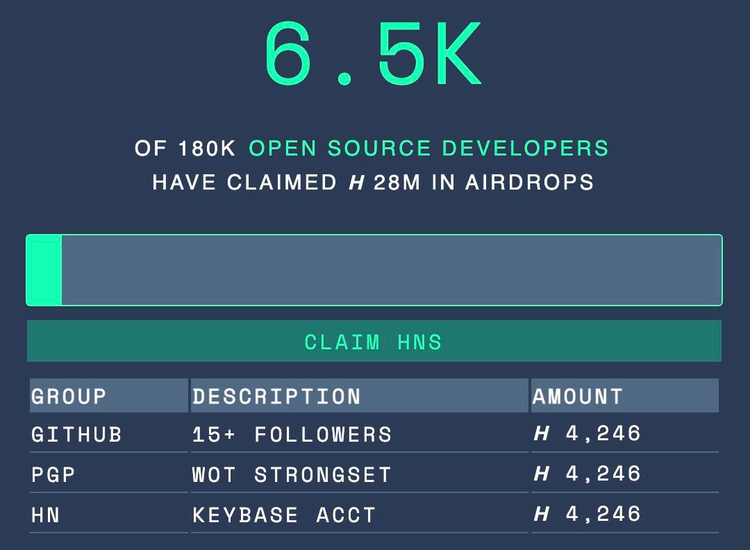 截至目前约有 6.5K 满足条件的开源开发者们已经认领了空投,每人可获得4,246.99 HNS币。按当时币价大约价值 1300 美元,换算成人民币则是差不多近 1 万元人民币。