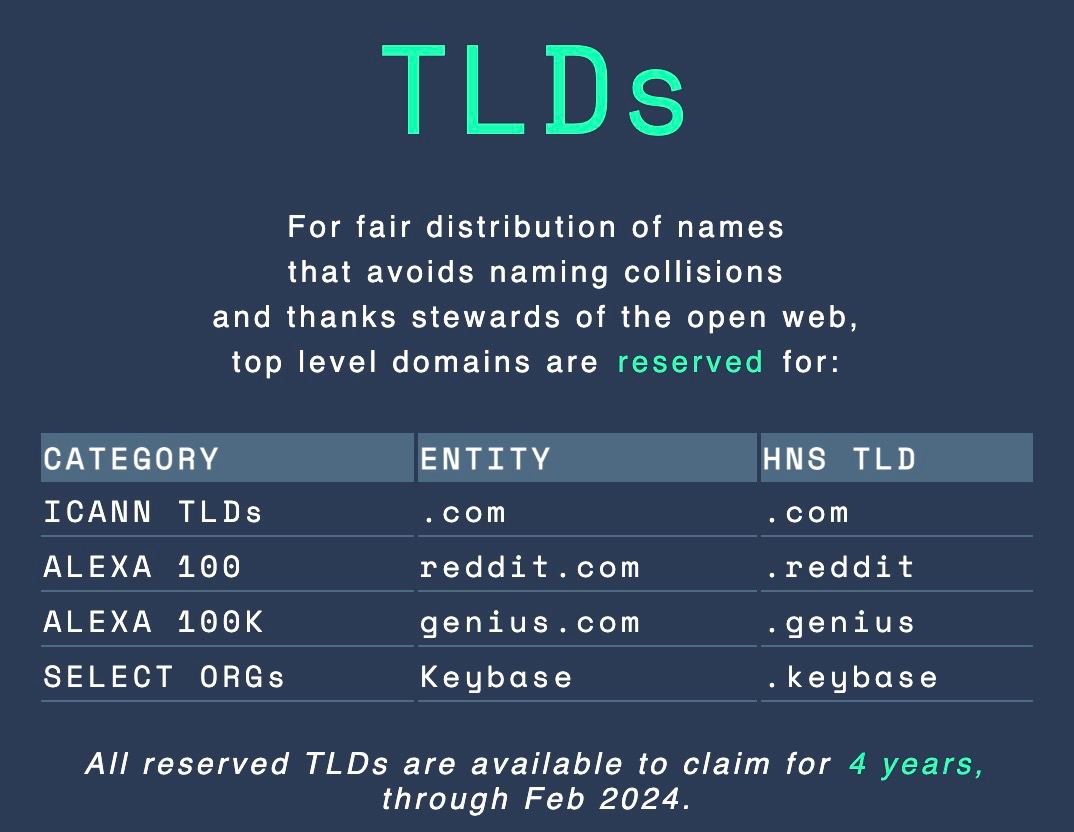 第一,Handshake 的域名均为顶级域名,类比 DNS 中 “.com” 的层级,拥有该类域名相当于拥有了权限级别很高的管理权力。例如A某竞拍获得了一个叫做 “.web3” 的域名,那么A某就拥有了这个顶级域名的管理权,之后所有发生在这个顶级域名下的新增域名及其相关事务,均需要经过A某管理确认。