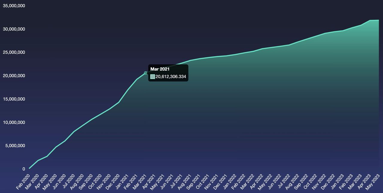 HNS 代币的燃烧发生在用户使用 HNS 拍卖顶级域名时,因为其拍得域名的等价值的 HNS 代币将会被直接销毁。在最初的一年期间 HNS 燃烧数量较大,截止到 2021 年 3 月,其燃烧代币总量就达到了2000万枚,其原因应该是在这最初的一年期间用户均在抢注一些热门的顶级域名,这类域名通常含有较高的价值,所以对应燃烧的等价值的 HNS 数量就多。而之后的两年期间,其代币燃烧数量与之前一年相比有所减少,燃烧数量曲线为平缓上升趋势,到 2023 年 5 月,其燃烧代币总量达到了将近 3200 万枚,两年期间共燃烧了 1200 万枚,其原因应该是由于前期高价值的顶级域名已被注册的差不多了,此时用户再继续注册的域名价值就有所下降,导致对应等价值 HNS 的燃烧数量也会变少。