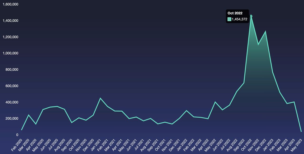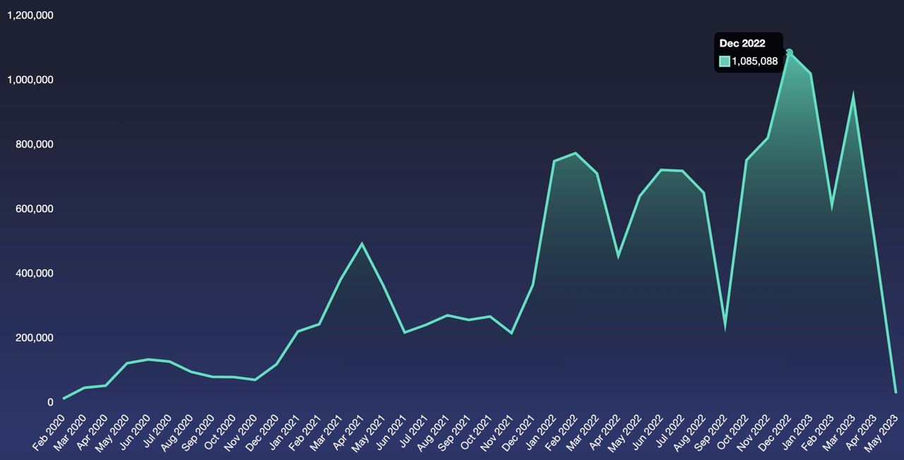 项目代币 HNS 可以用于在 Namebase 上进行顶级域名竞拍及二级域名注册等交易。从 2020 年 2 月开始一直到 2022 年 8 月期间,每月的交易活跃度均处于在30万笔交易上下波动的情况。而在 2022 年 10 月及 12 月,交易活跃度突然达到了近150万笔和130万笔之多,可以看出在 2022 年的四季度期间是交易活跃度有史以来最高的阶段。
