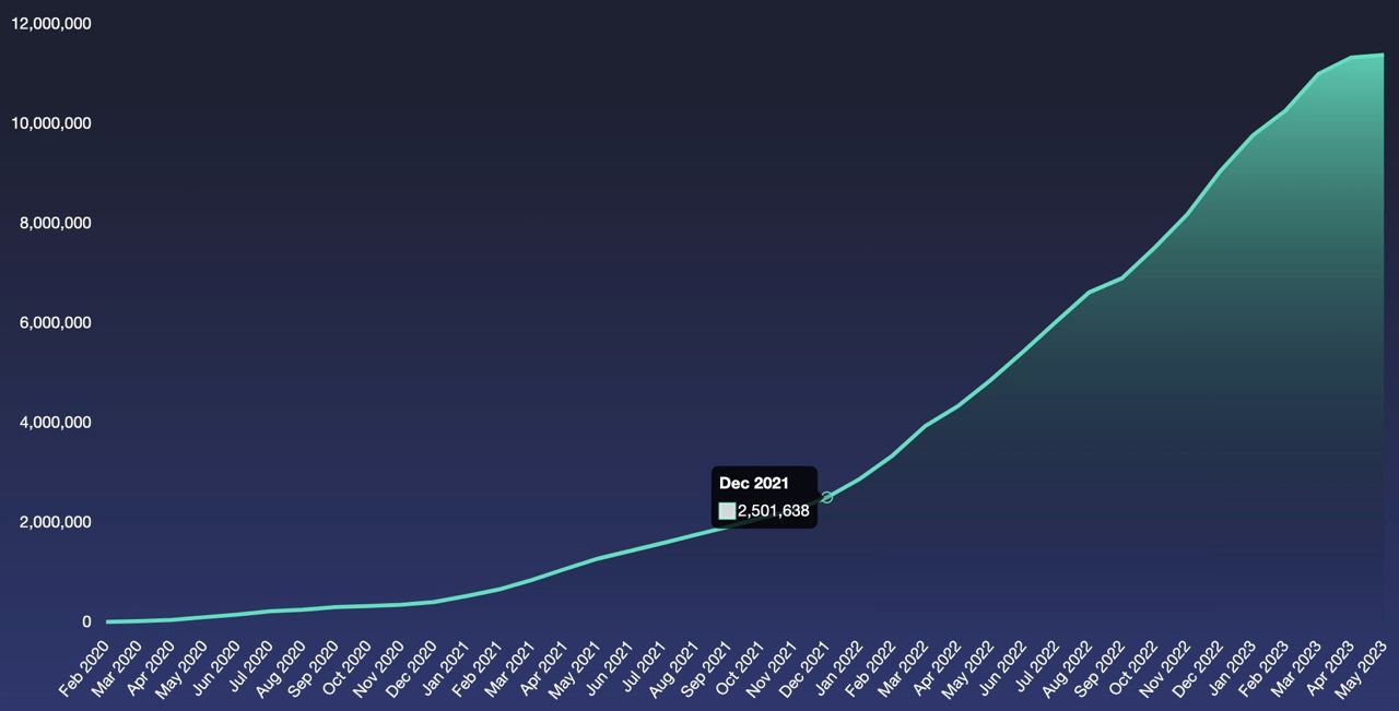 Handshake 项目在 2020 年 2 月开放去中心化域名注册后,域名注册数量逐年上升。从图中可以看出,前两年的累积注册域名总数量是一个平缓上升的过程,到2021 年底,累积注册域名数量为 250 万个。而从 2022 年开始,域名注册数量的增长率明显增高,且持续以该幅度增长了超过一年,到2023 年的一季度结束,累积注册域名数量已达到了 1000 万个。2022 年大幅增长的原因应该是 Handshake 项目完全释放出了所有的域名注册额度,参与项目的用户也比较积极的去尝试和探索这个新思路,希望在这个去中心化的域名系统中拥有真正隶属于自己的域名。