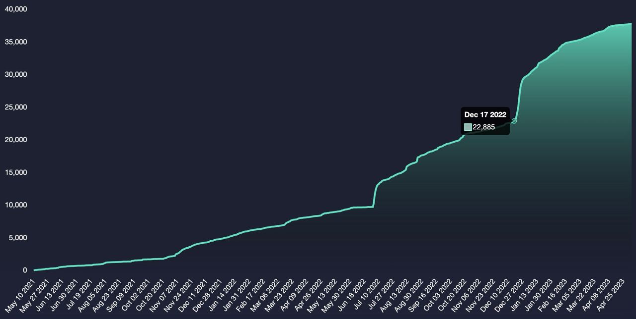 随着顶级域名的注册及拍卖完成,在顶级域名下注册的二级域名的数量也在不断攀升。从图中曲线可以看出,二级域名的注册数量从 2022 年 7 月开始有了显著提升,到 2022 年 12 月已经达到了 2 万多的注册数量,而之后只用了十天就达到了将近 3 万的注册数量。截至目前,二级域名的注册总量达到了将近 3.8 万。