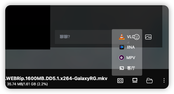 如果电影播放的时候没有画面或者没有声音,那是因为电影的格式跟播放器不兼容。这个时候你可以使用外部播放器播放。BEE 的右下角,有个电脑的按钮,可以看到支持的外部播放器。