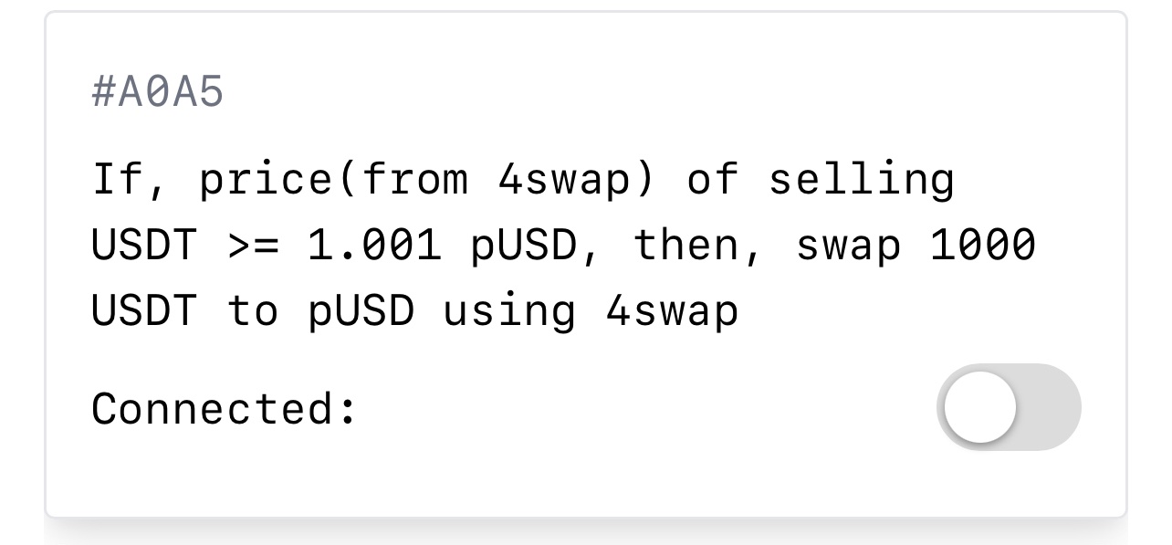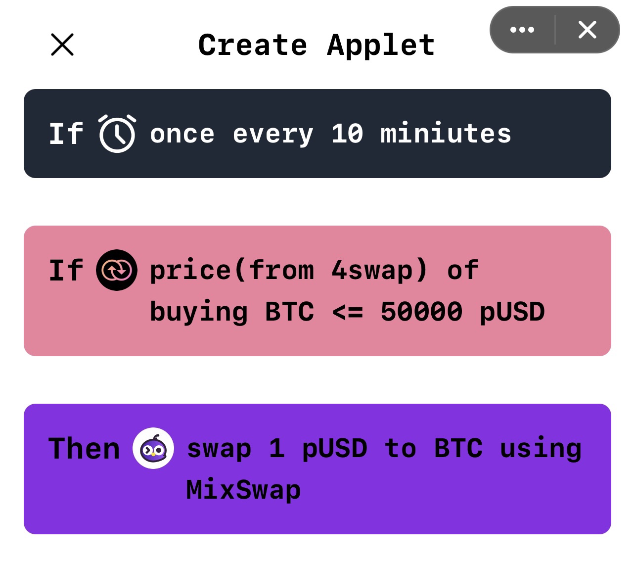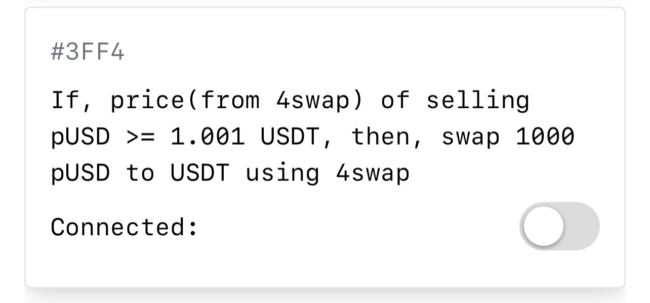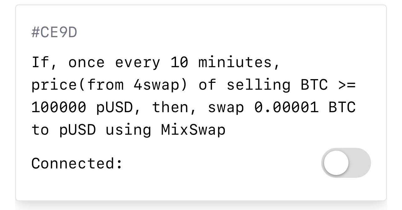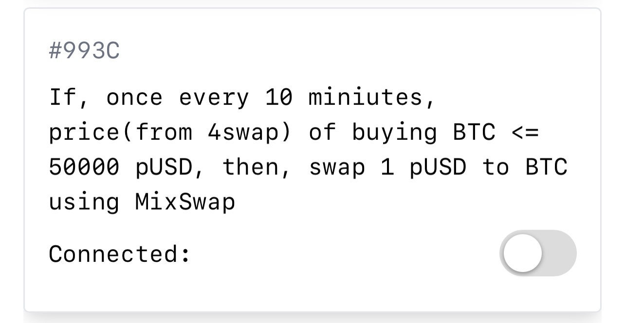 如果(If)4swap 上买入 BTC 的价格小于或等于 50000 pUSD,每隔 10 分钟,就(then)在 MixSwap 上把 1 pUSD 兑换成 BTC