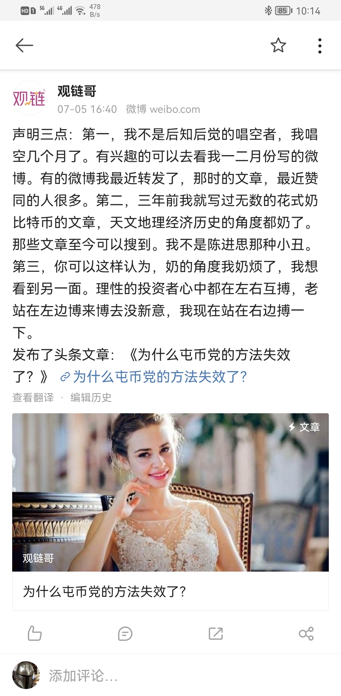 微博上有个@观链哥的大V在鼓吹周期波段策略。我想了一下,如果我能在六万的时候逃顶,两万的时候抄底,那么我就多了三倍的收益,将来大饼到100万一个的时候,我也能得到三倍的收益,300万。存在的风险是,我可能被甩下车,可能大饼还没到我抄底的心理价位的时候,就开始反弹了,这个概率...