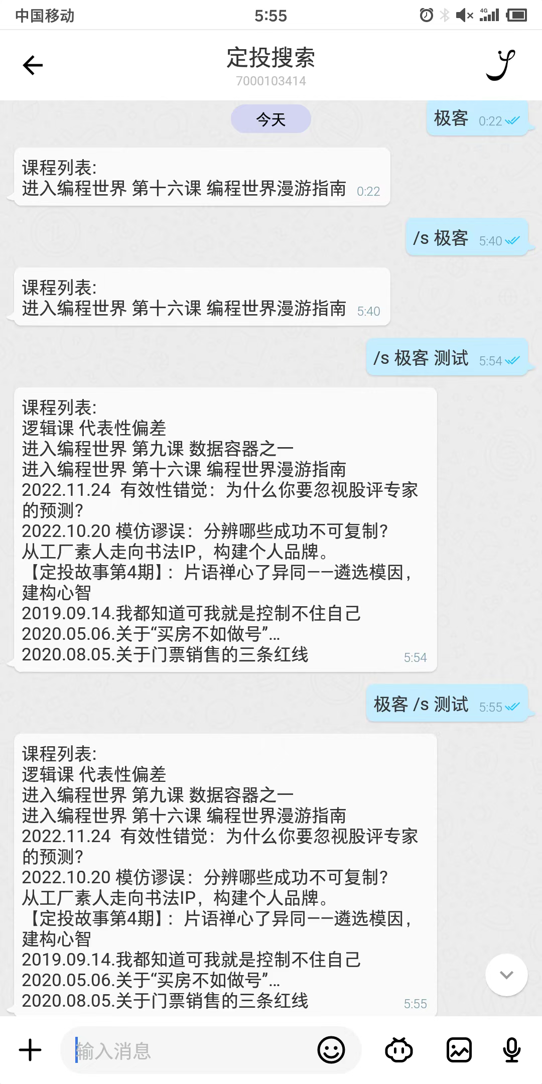 命令,这样可以减少输入,如发送的消息是「极客」时,等同于发送「/s 极客」。