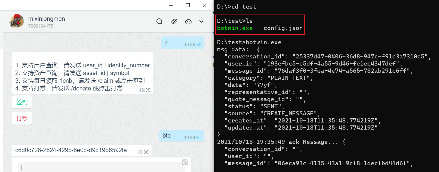 config.json,与下载的文件放在同一个目录 - 启动应用,在Mixin Message里添加对应的机器人之后就可以进行交互了