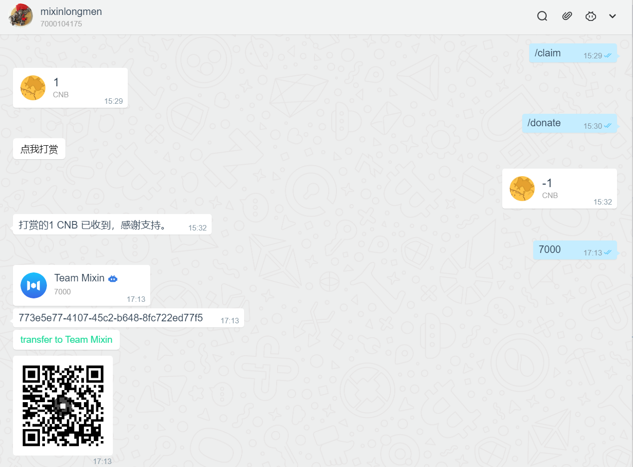 - 将 url 构建成二维码,然后上传到 mixin 服务器,并发送给用户