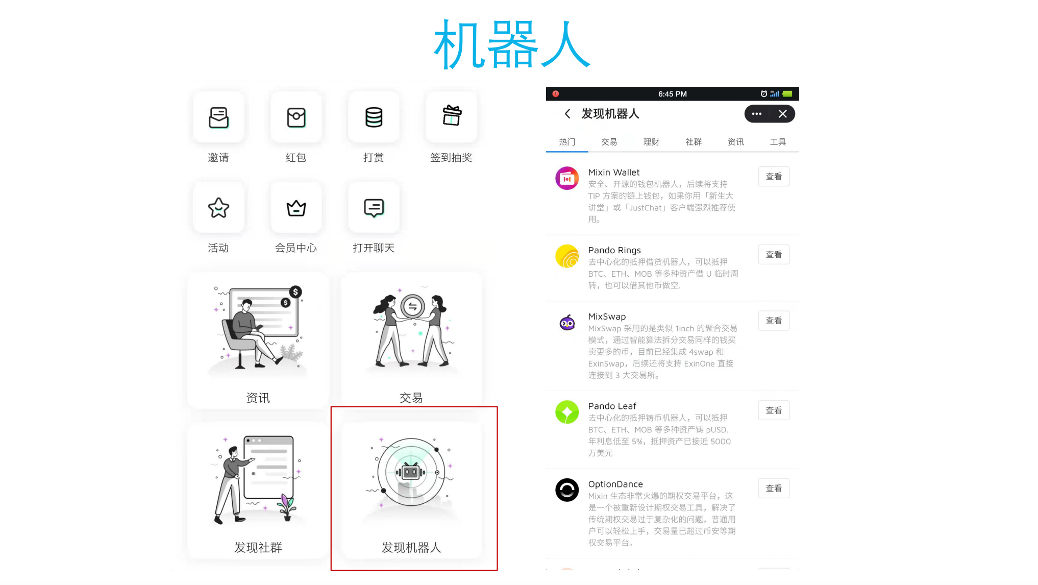 扩展性方面,首先基于Mixin Network对公链、MVM和NFT的支持,可以增加相应的资产,基于机器人的方式,很方便的开发应用,迁移其他公链的应用,现在就有国外的公司在基于MVM开发DAO工具,NFT也可以给Messenger上的社交带来新的玩法。