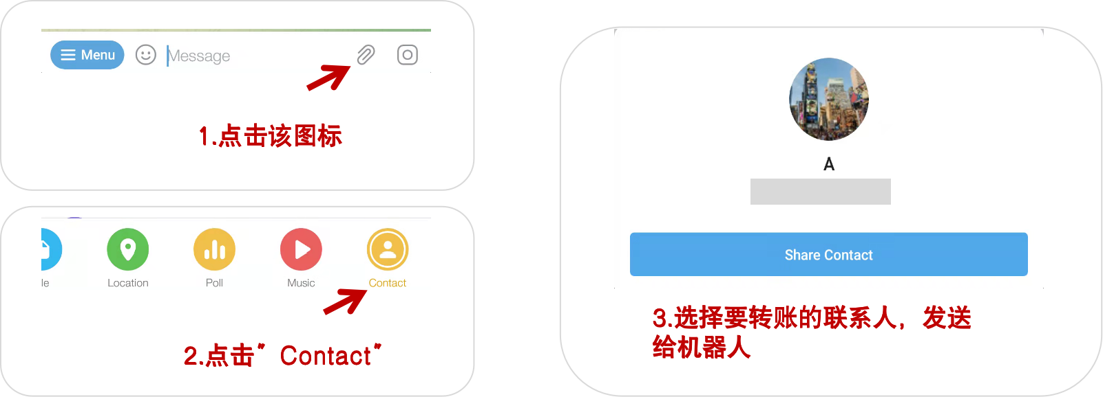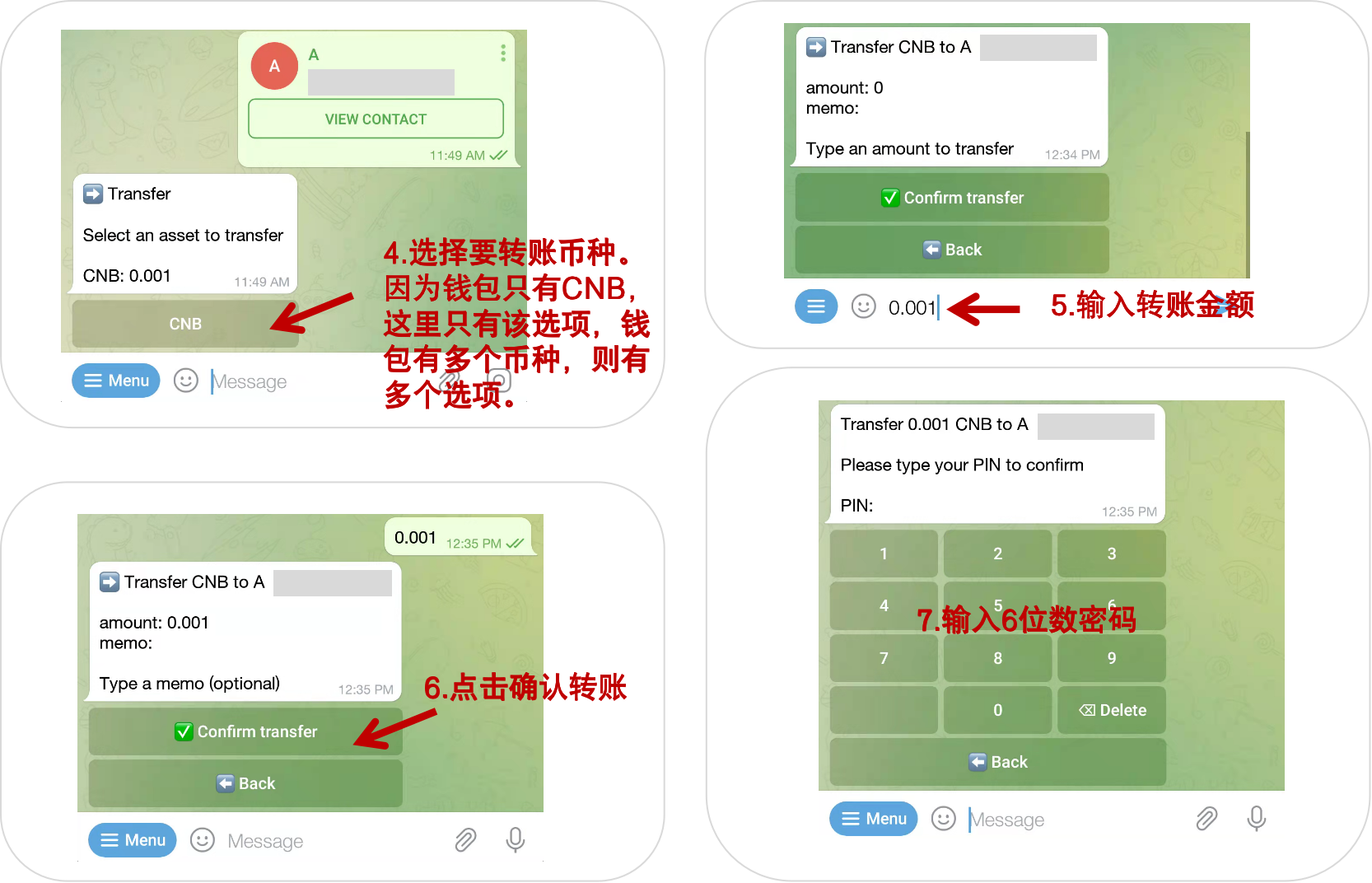 如果想转账给联系人A,需要将A的卡片发送给MixinWalletBot,具体如下图操作。