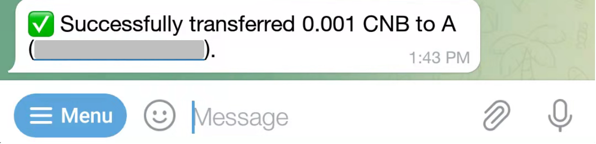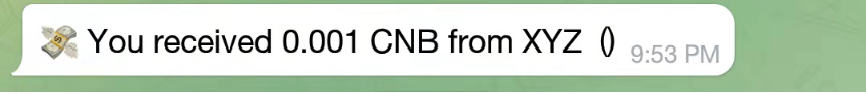 添加好机器人后,钱包里有0.001个CNB,CNB是Mixin生态的MeMe币(模因币),可以用来做一些测试,现在将0.001个CNB转给Telegram好友。