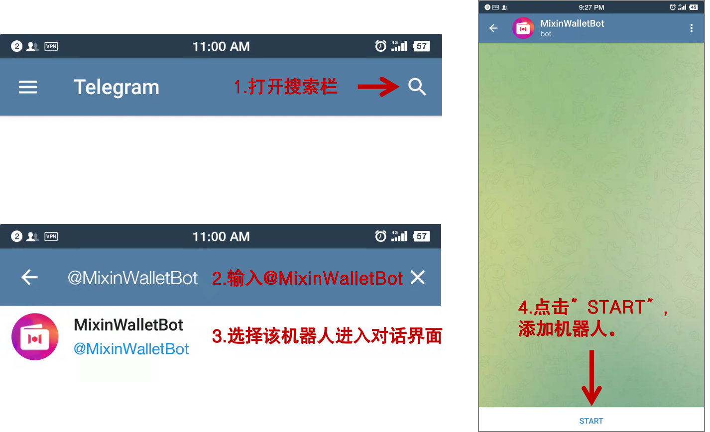 打开Telegram搜索栏,输入@MixinWalletBot,选择该机器人进入对话界面,点击“START”。