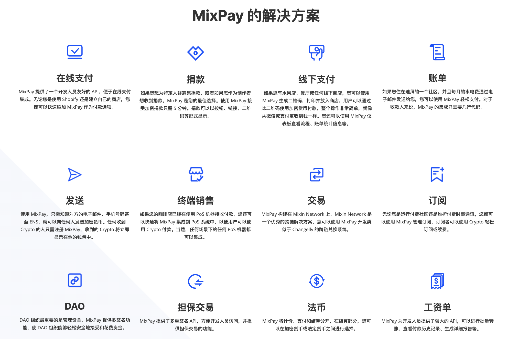 MixPay支持的这三种模式 ,可以覆盖非常多的场景来去解决特定的问题。解决方案这一块,比如说有 在线支付、线下收款, 打赏 、捐赠、账单,pos 系统、买卖加密货币、跨链闪兑、 支付薪水 、订阅、担保交易 、去中分化治理,保证金交易等等,可以覆盖到二十多种场景,所以说它是一个非常强大,覆盖面非常广的一个系统和方案。