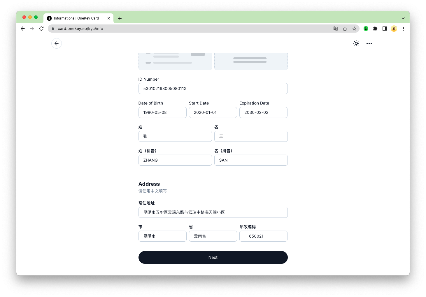 进行实名认证,信息添加完毕后,点击 【Next】