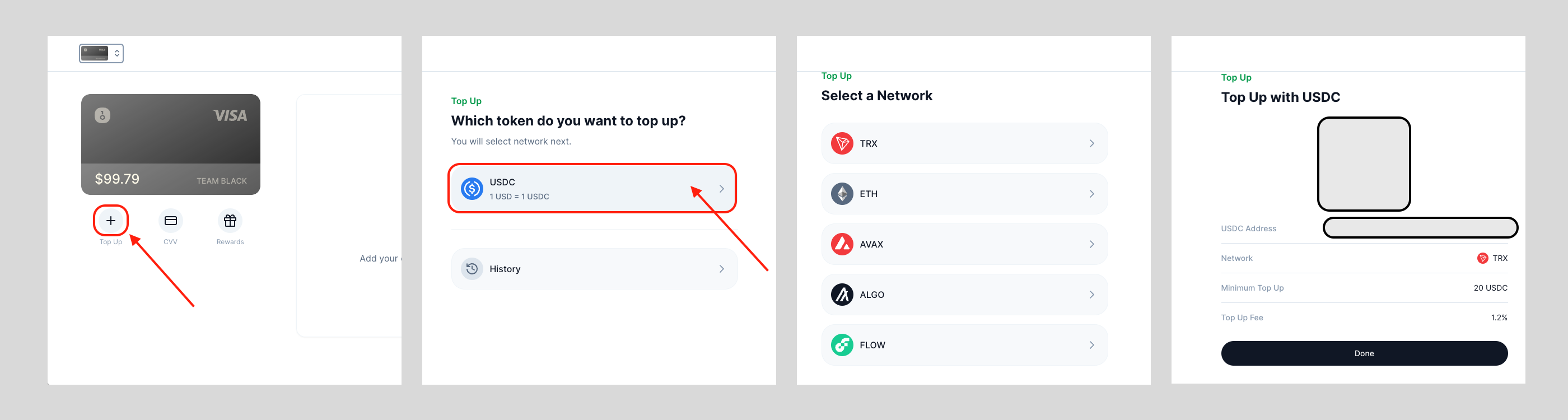 点击 USDC ,选择要充值的链进行充值。(暂时先开放了 USDC 充值)