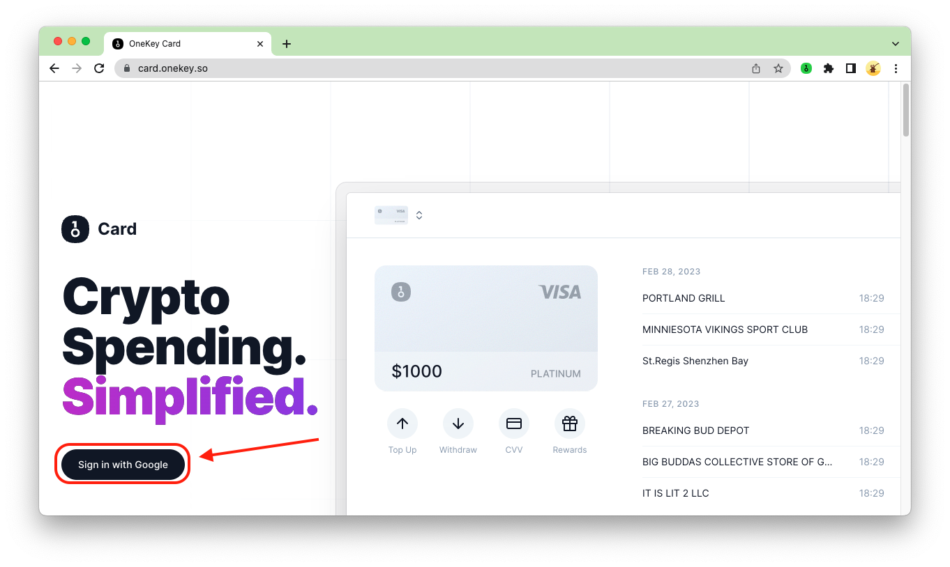 点击官网链接:https://card.onekey.so 进入注册界面,点击 【sign in with Google】,使用谷歌账户注册