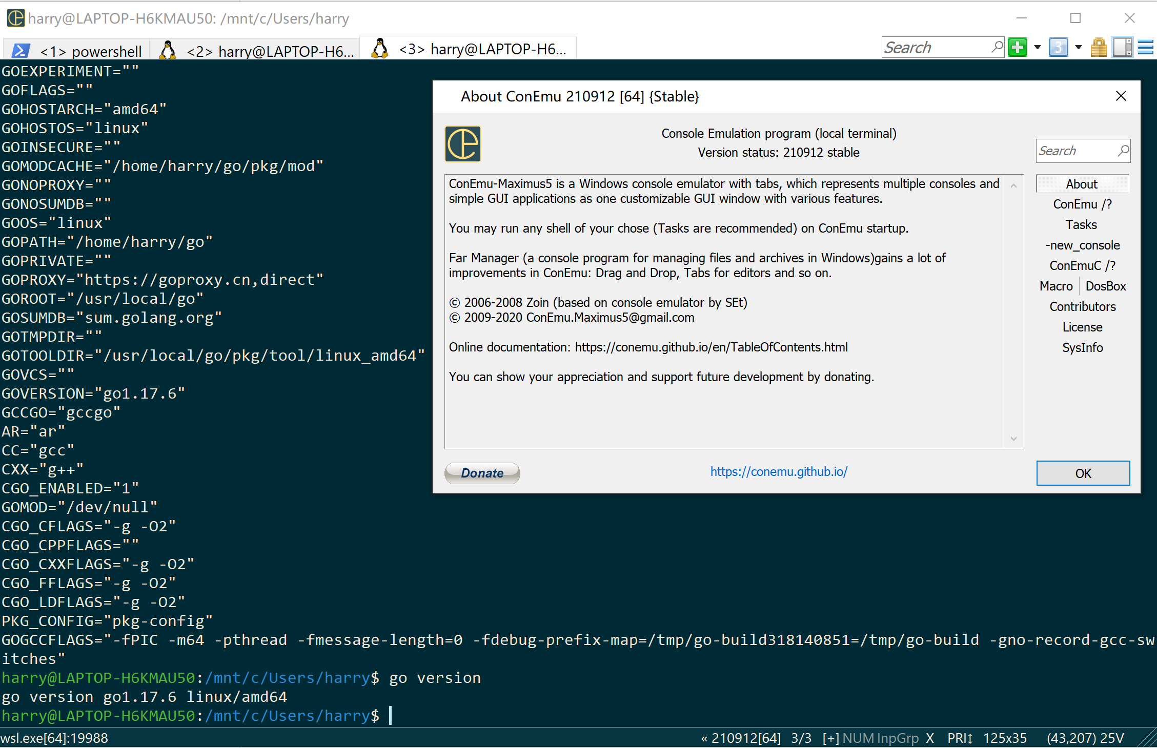 详细写一下 Linux版编译器的安装,Linux 我用 WSL 一个内置在 Win10 系统里面的 Linux 系统,装的是Ubuntu;Ubuntu 默认黑屏终端太丑了,我用 ConEmu 替代,大概这个样子,