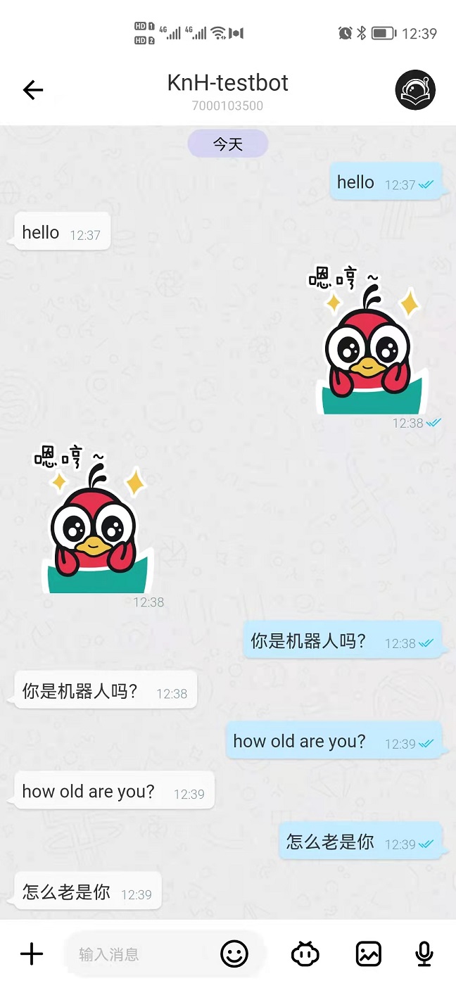 打开 MM 添加刚刚创建的机器人,发送内容,我们可以确认到 Bot 返回我们发送的内容。