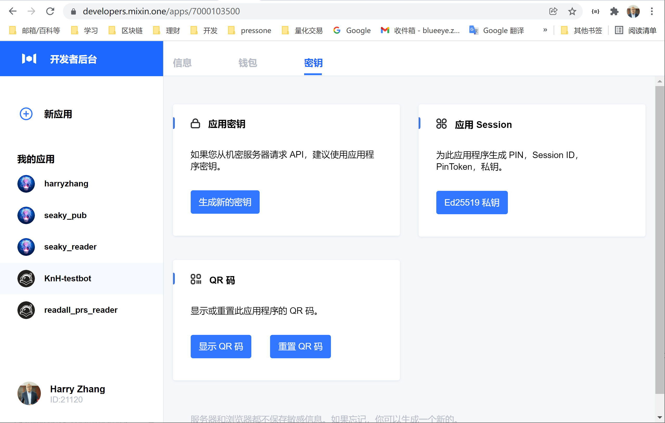 分别生成应用的密钥(授权访问Network信息的时候须要)和应用 Session;应用 Session 会导出一个基于 Ed25519 加密的 keystore 文件,这是机器人的 Network 账号信息,类似于 User 的 Network 账号一样唯一决定该机器人的资产,所以要妥善保管,最好将 pin码 和 keystore 分开加密保存,使用的时候临时解密使用。将 pin码 剔除后的 keystore 文件保存到项目目录中,我们进行下一步