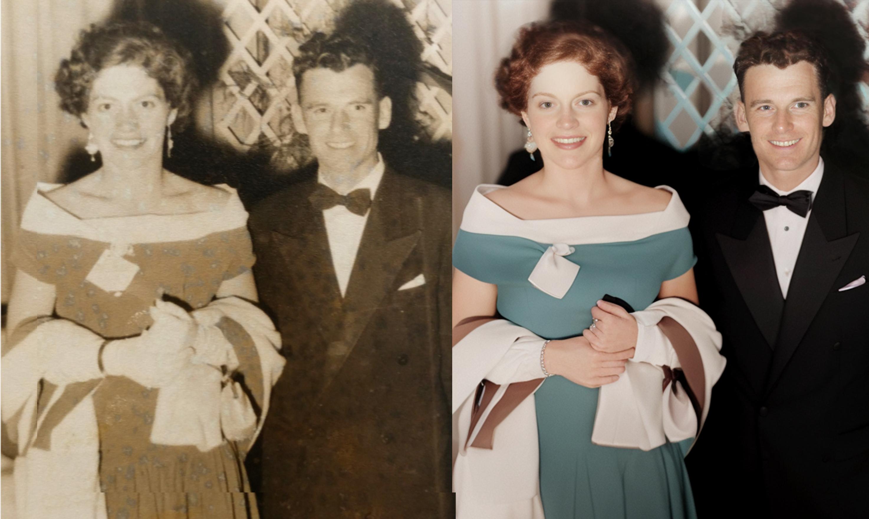 这张照片是[Reddit](https://www.reddit.com/r/StableDiffusion/comments/11hzsrs/controlnet_did_a_good_job_rejuvenating_a_stained/) 上一个用户分享的,他利用最近图像生成领域热门的[ControlNet](https://github.com/lllyasviel/ControlNet) 技术,将自己90岁的祖父母70年前模糊的老照片变换成了清晰的彩色照片。虽然仔细对比的话,也会有一些瑕疵,比如女士的六根手指,手指上多出来的戒指,手镯样式的不同,男士衬衫上多出来的纽扣,背景的差异等,但整体效果已然十分惊艳。