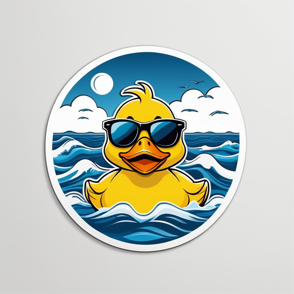 /i sticker design, yellow duck with sunglasses chilling in the ocean, polished, white background –ar 1:1