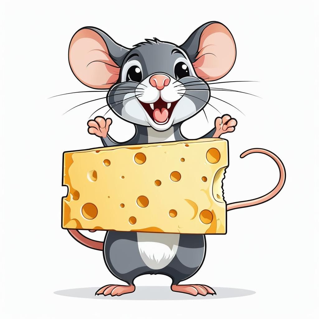 /i sticker design, cartoon animation, 2D flat design, vector art, extremely happy rat holding a big block of cheese, victory pose, white background –ar 1:1