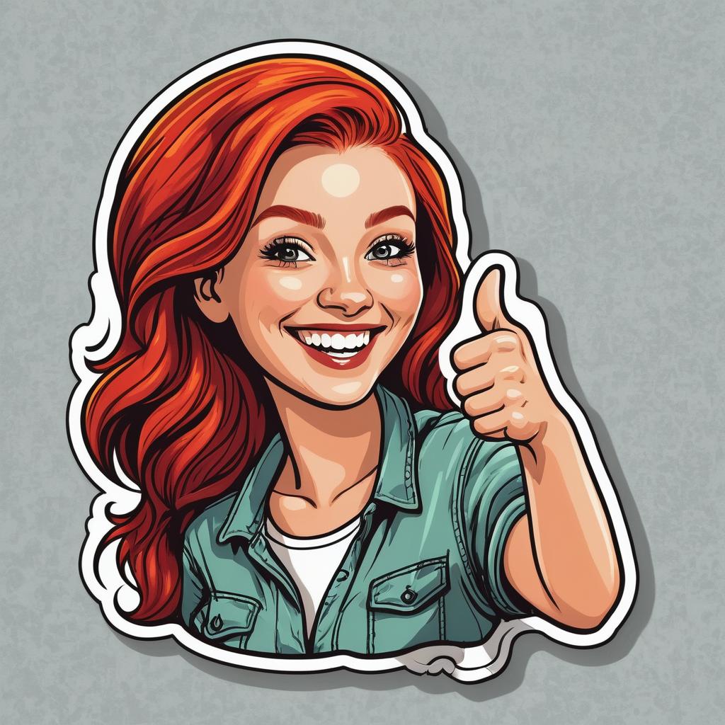 /i sticker design, young woman with red hair and a big smile holding a thumbs up, happy, excited, white background –ar 1:1