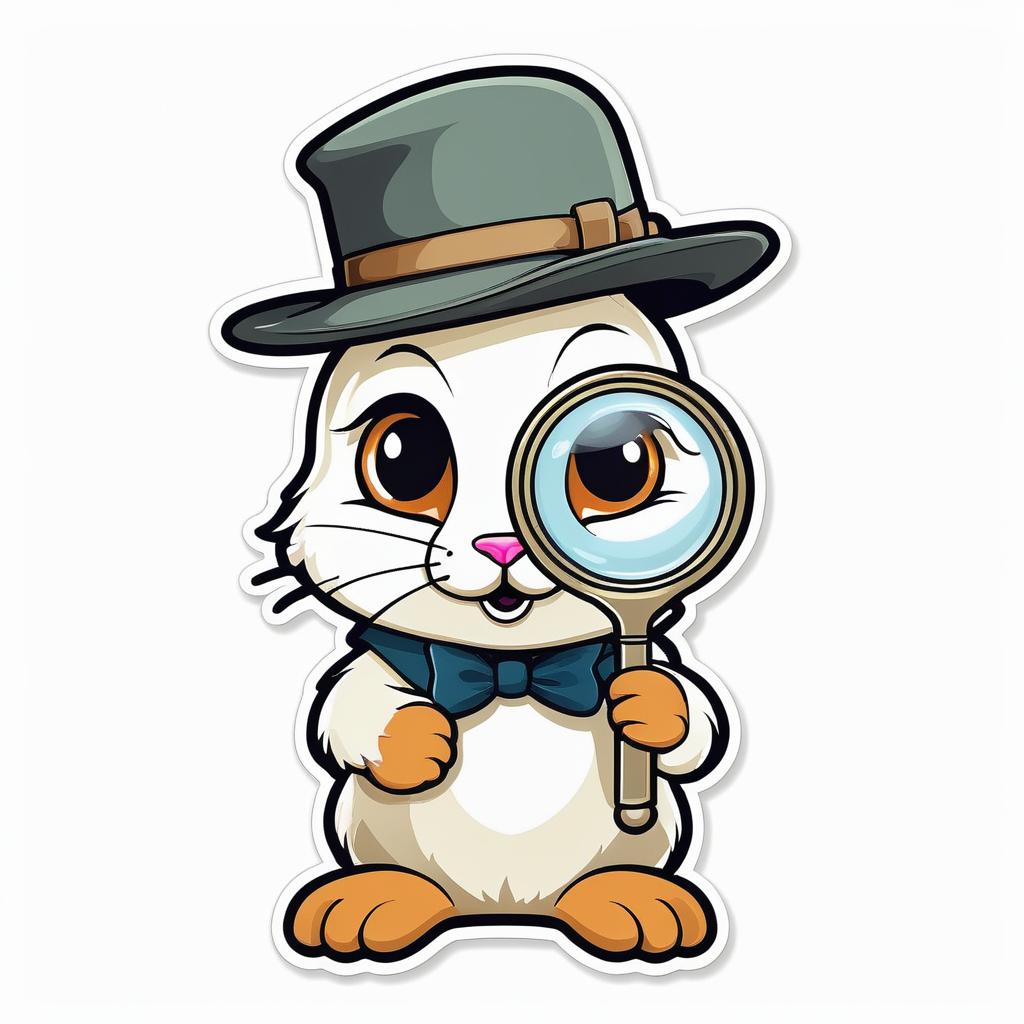 /i sticker design, cute rabit holding a magnifying glass in front of one eye and wearing an old English style detective hat, 2D flat design, simple,white background –ar 1:1