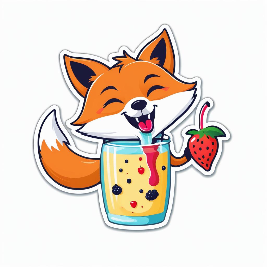 /i sticker design, anthropomorphic fox drinking a fruit smoothie and winking with one eye, happy, smiling, 2D flat design, white background –ar 1:1
