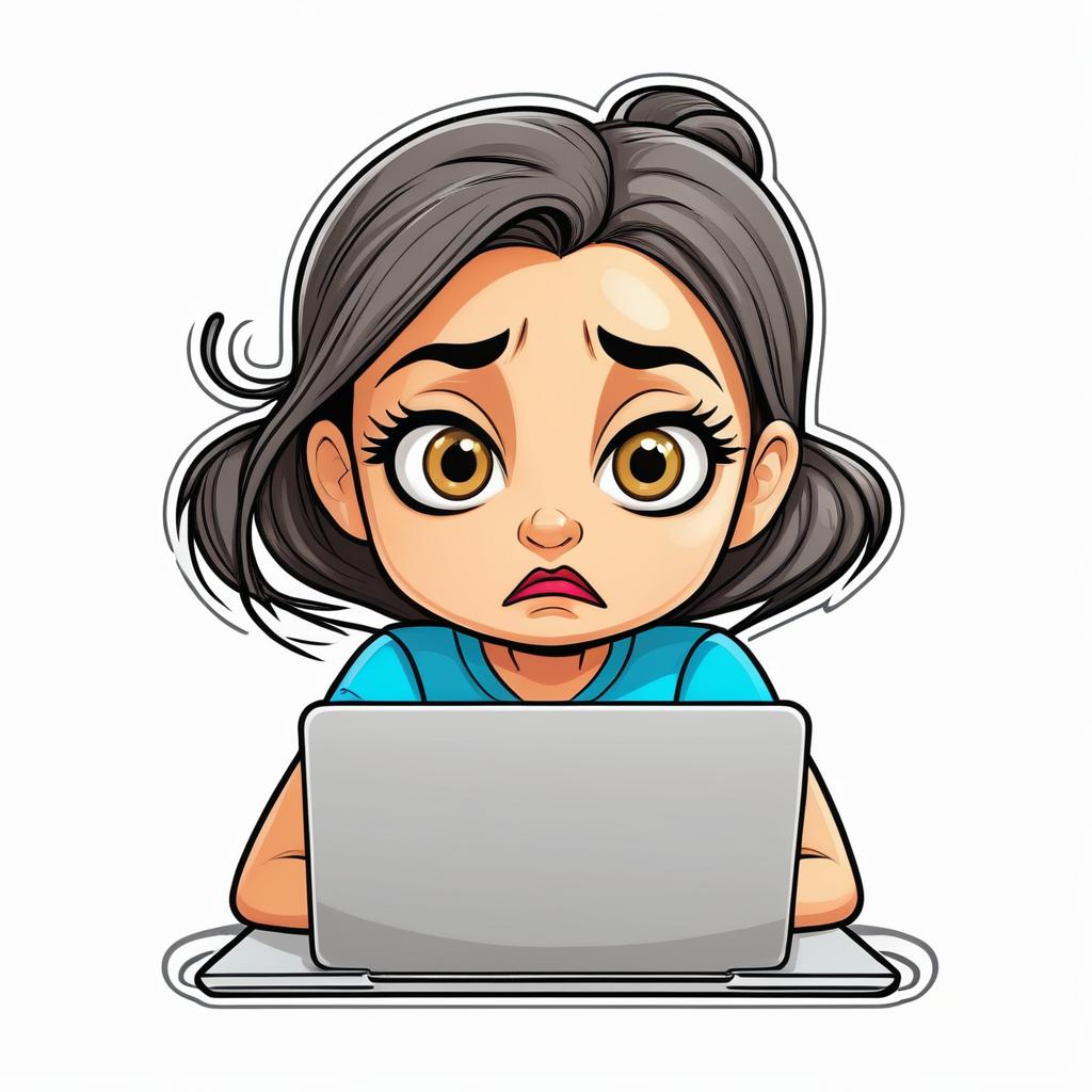 /i sticker design, cartoon character style, annoyed girl in front of a laptop, comical, white background –ar 1:1