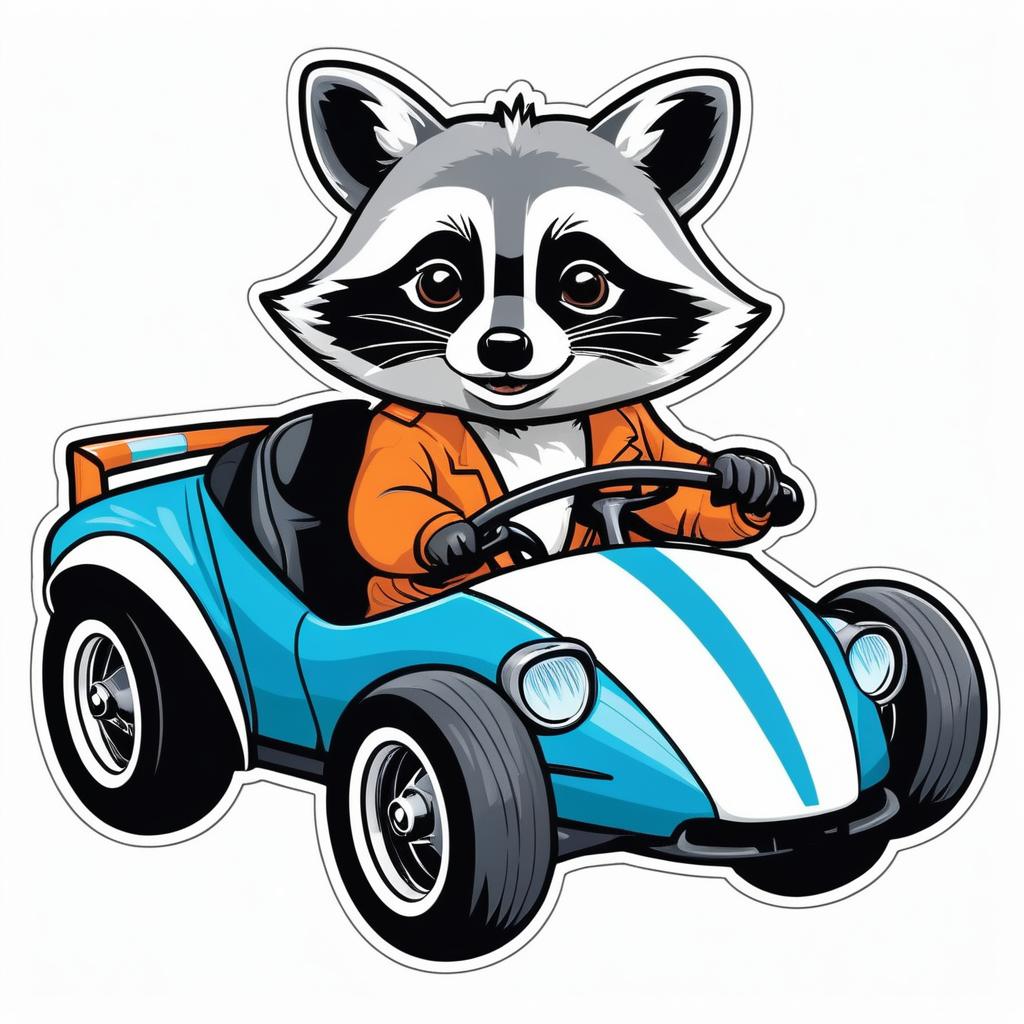 /i sticker design, cunning anthropomorphic raccoon in a race car driving away from the camera, deceitful, cartoon aesthetic, funny, white background –ar 1:1