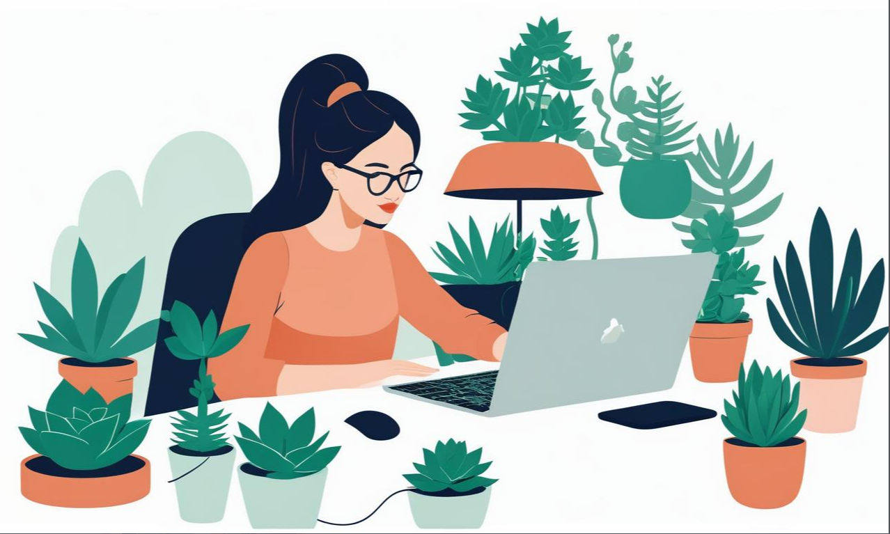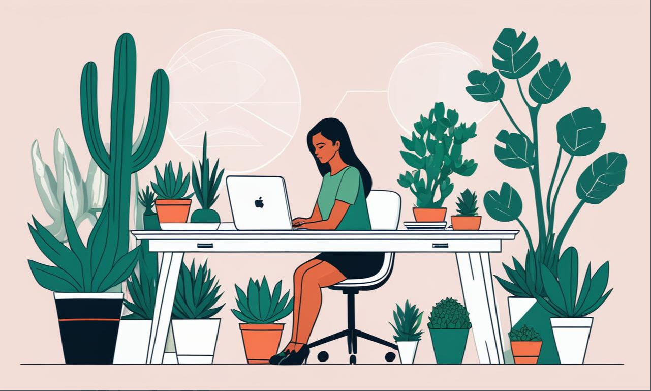 /i tech illustration, woman at desk surrounded by succulents, simple minimal, by slack and dropbox, style of behance –ar 5:3 –num 4