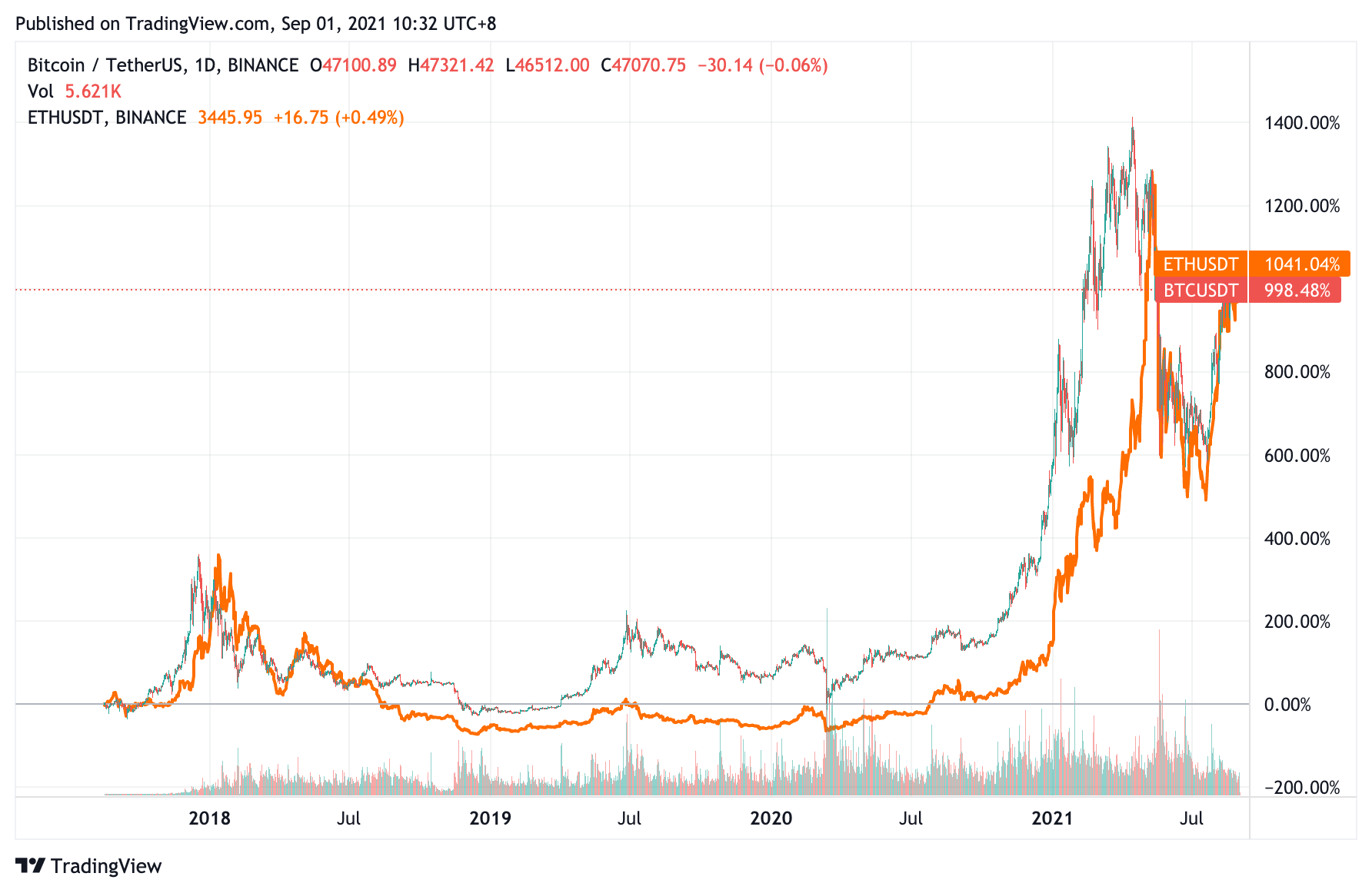 2017年8月-2021年9月,以太坊和比特币价格对比走势图