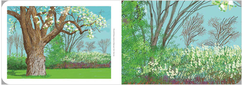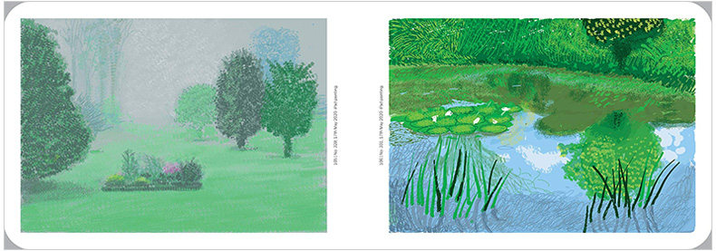 这本新画册呈现出来的,是四、五月春天茂盛的新绿。2020年初,就在全球因COVID-19居家隔离的时候,DH就在他位于诺曼底的新房子、工作室和花园,仔细观察了这里的春天,并用iPad画了出来。116幅作品,不同层次的绿撞到眼睛里,美好到令人落泪。