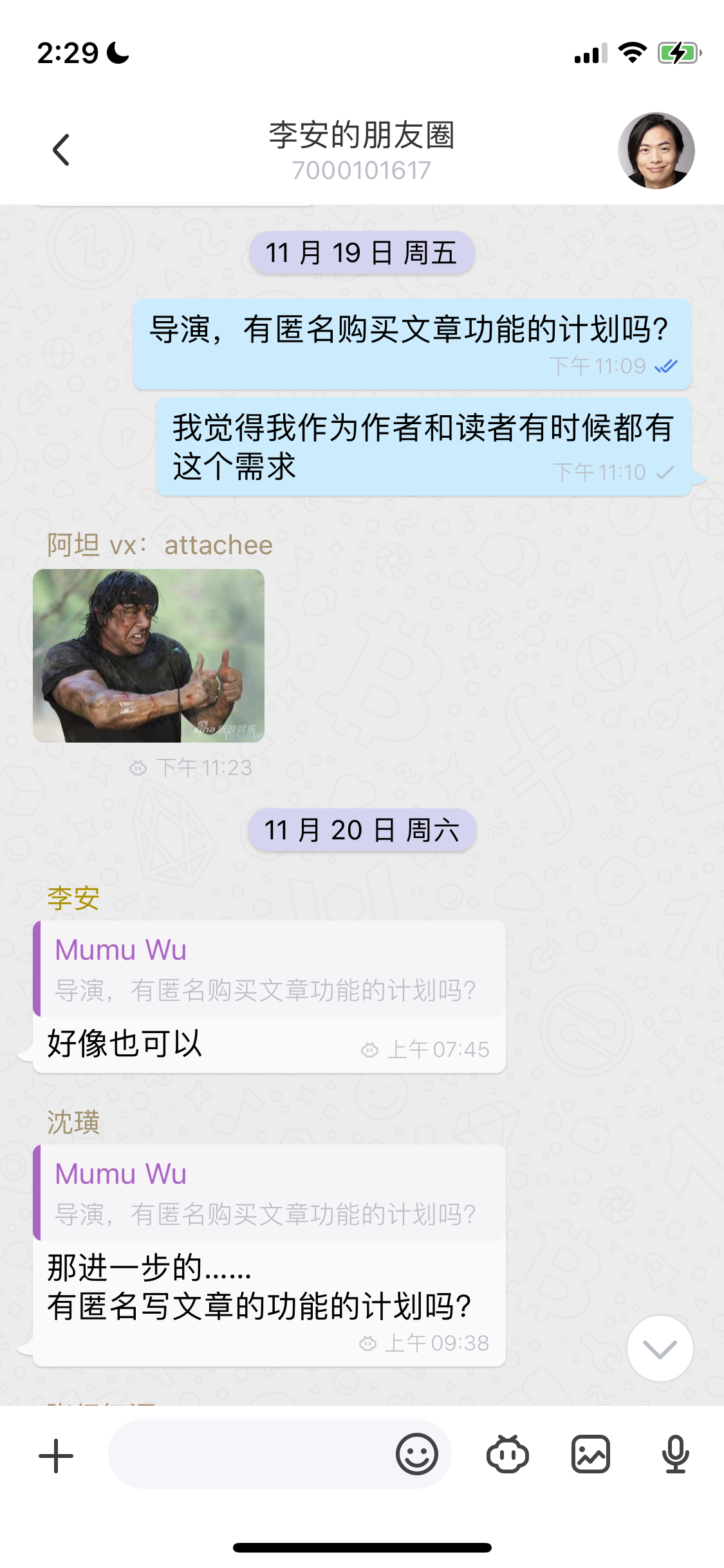 2021年11月9日,我在“李安的朋友圈”中问到,顶呱呱有支持匿名购买文章的计划吗?