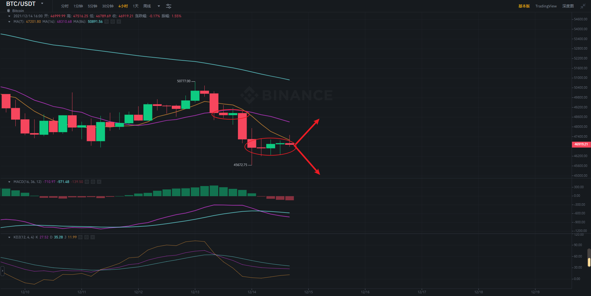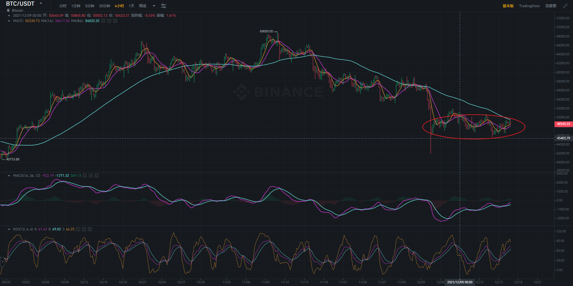 目前还处于震荡区间内,还是没有脱离,目前仍处于4H 84线的有效压制下。