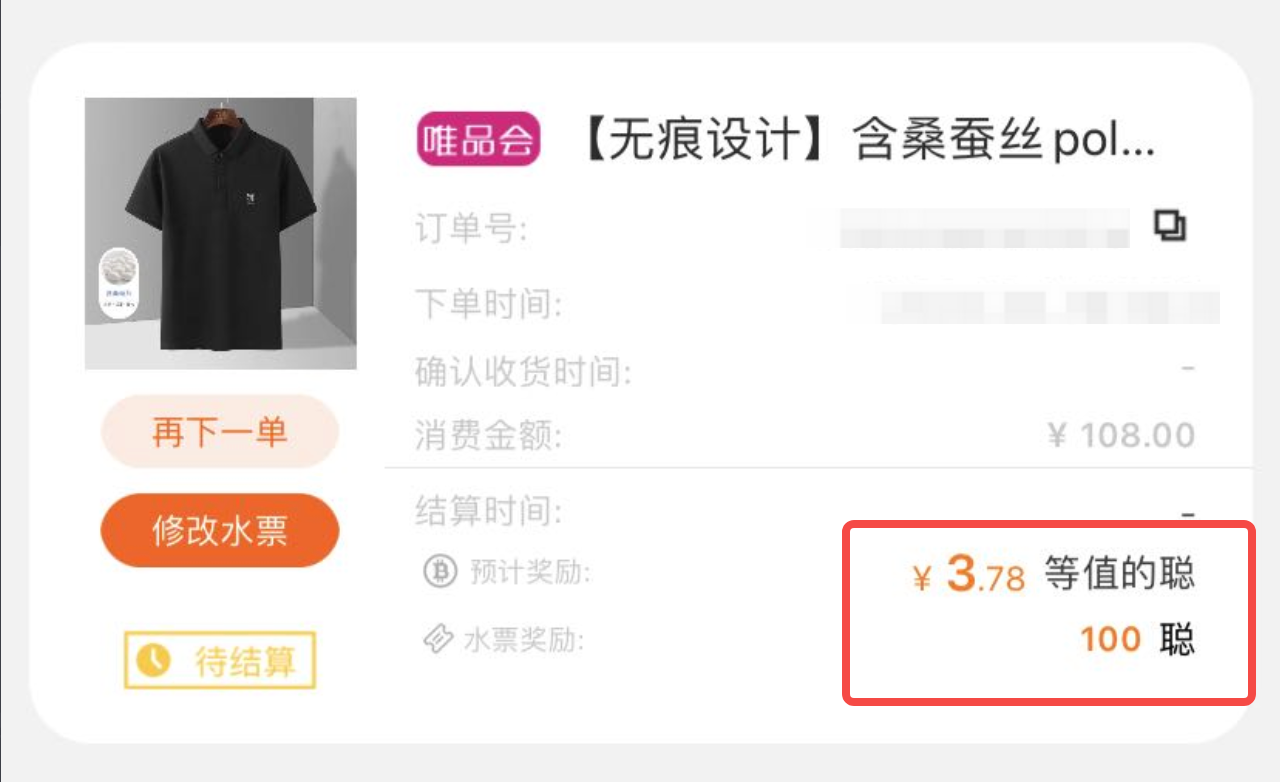 举个例子: 用户 A 的账户有一张面额「 100 聪」的无门槛使用水票,通过水龙头App搜索唯品会上的一件衣服,显示奖励金额:「¥3.78 等值的聪」,去唯品会完成购买后,返回水龙头App查看订单时,订单列表上的奖励信息会显示: