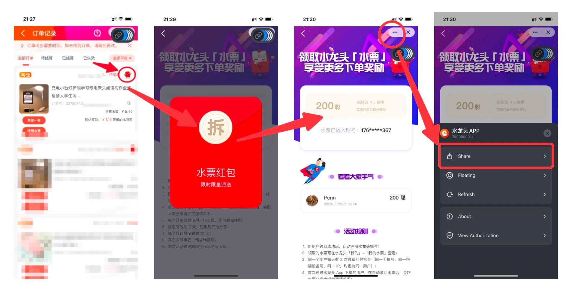 就这样怎么能配得上「牛逼」的称呼,您还可以分享水票给好友领取,如果是一个从未使用过水龙头App的新用户,领取你分享的水票后会建立邀请关系,被你邀请成功的人,下单的奖励会给你分成的噢,邀请奖励在每个月 21 号结算日的时候一起发放。