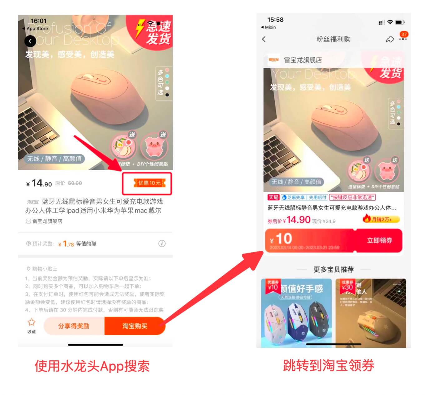 - 在水龙头App中搜索商品后,我们发现有一个「优惠券 10 元」,点击后可在淘宝领取;