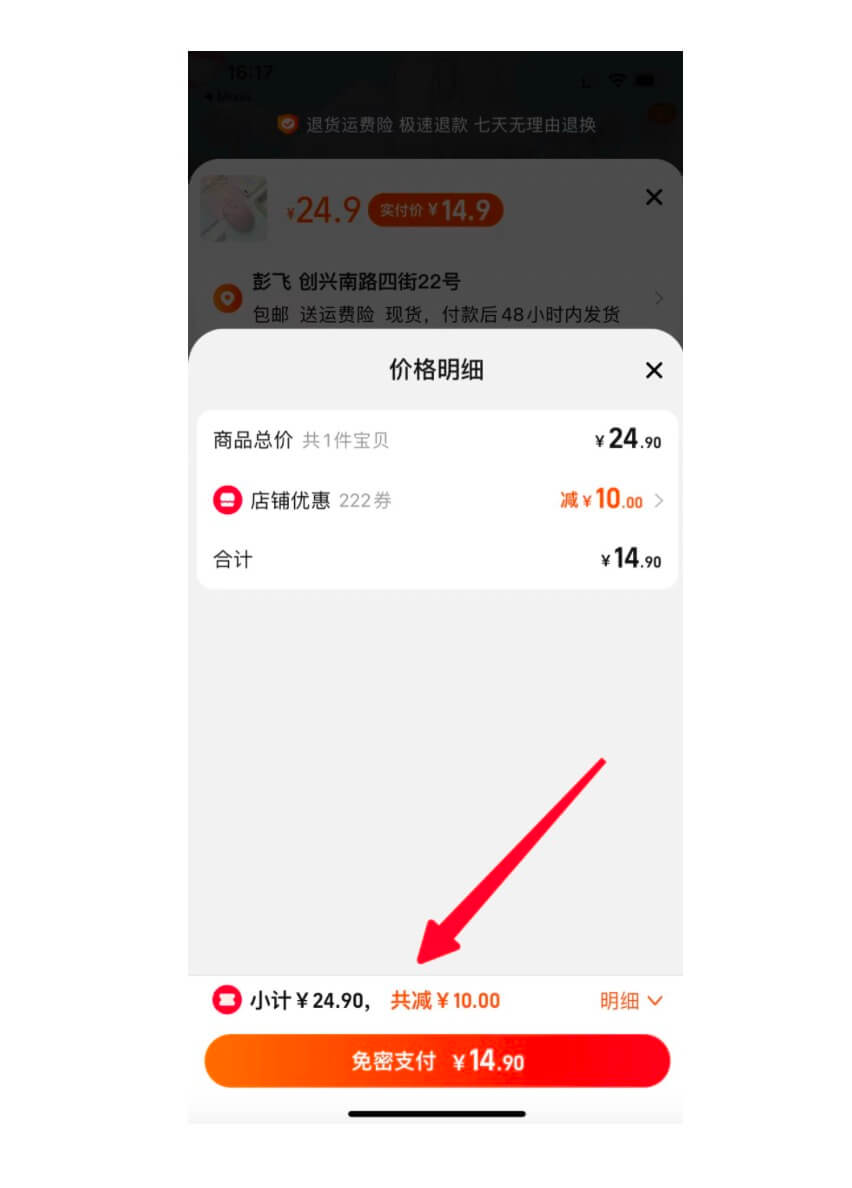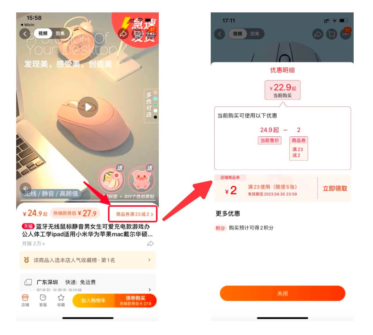 - 接着我们直接在淘宝打开该商品,寻找这个「优惠券 10 元」。但结果发现这里并未显示 10 元优惠券,仅有一个「满 23 减 2」的满减券;