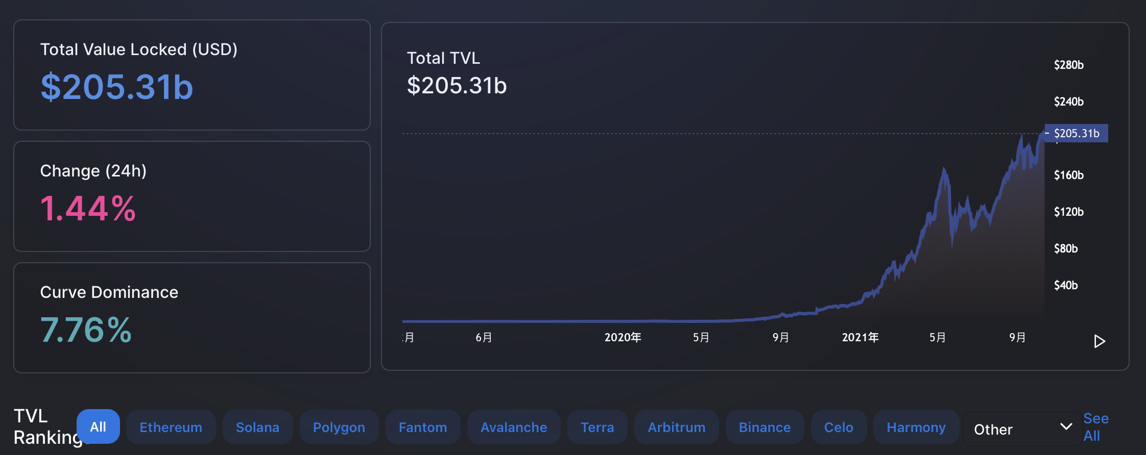 在依托交易所用户资源的币安智能链BSC、火币生态链HECO等崛起后,专注提速、降费的Matic、Solona、Avalanche、Fantom、Luna等公链斥巨资扶持生态,迎来了百花齐放、多链并存的局面,DeFi应用也因此进入了数量上的爆炸期,锁仓量在近期突破了2000亿美金。