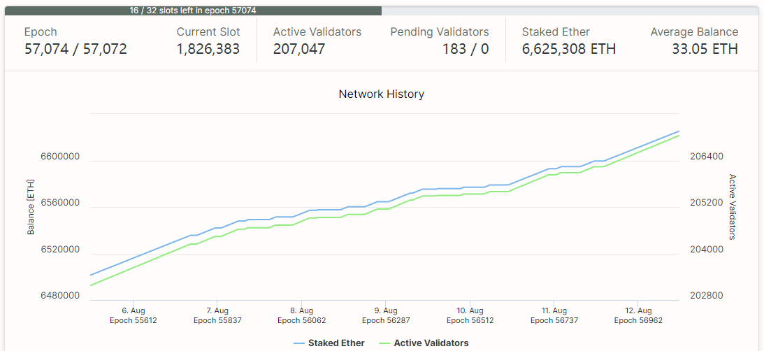 POS网络上线8个月以后,已拥有超过20万个活跃验证者,网络中已经质押662万个ETH,几乎占ETH总流通量的6%。截至目前,Staking的年回报率约为6%。