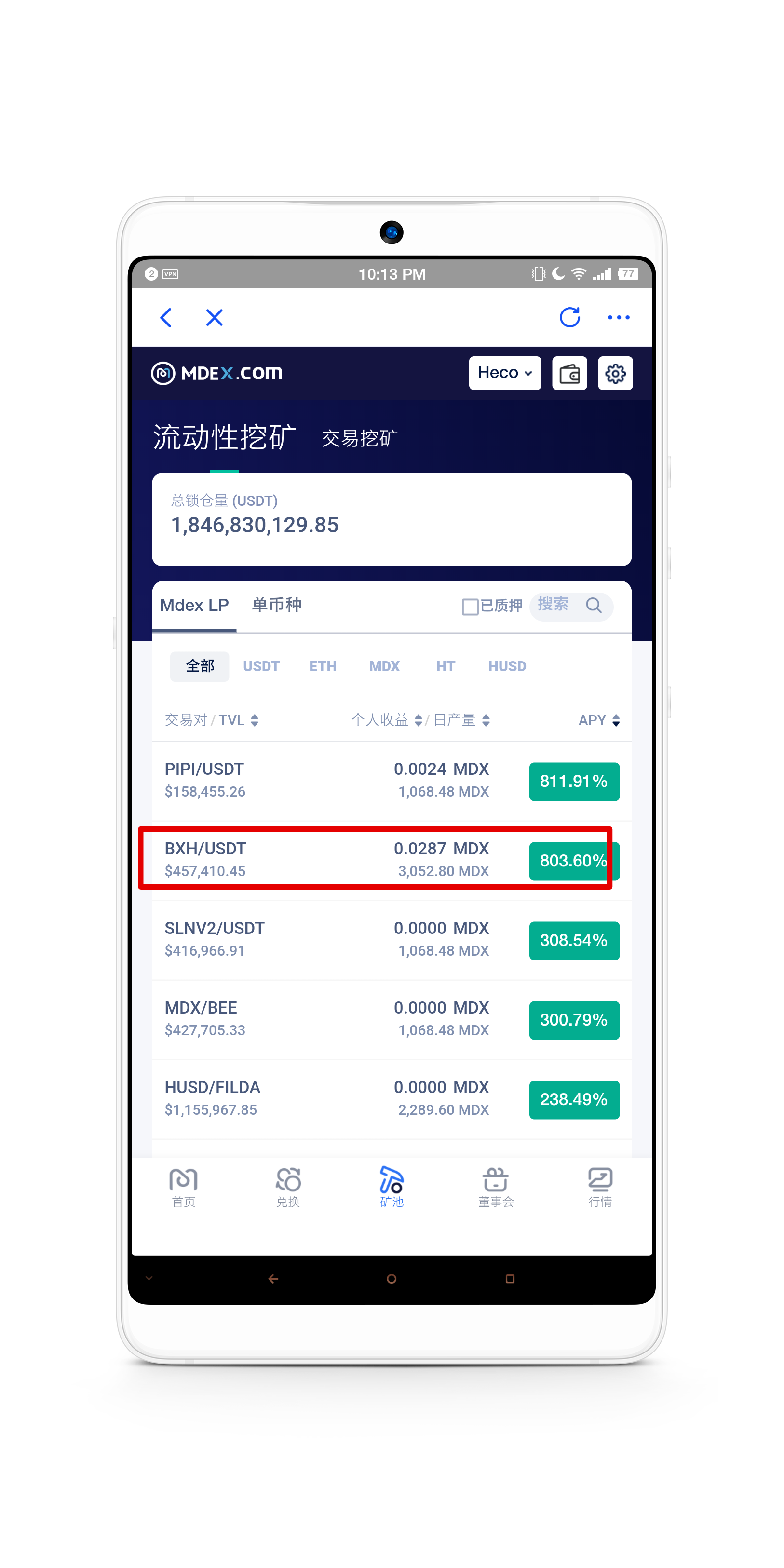 今天在火币生态链Heco挖——质押 BXH、USDT ,获得MDX,APY(收益年化)是803.60%(截止截图的时间,具体数据以官网更新数据为准)。