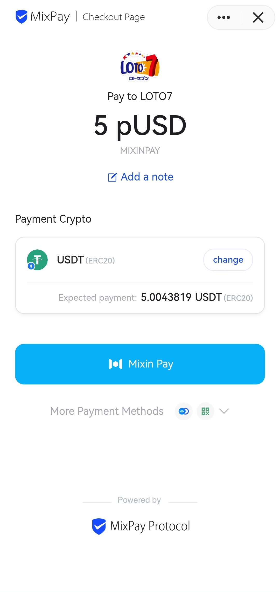 如果您选择了单期购买,则会进入付款方式的选择界面,您可以选择MixPay(Mixin钱包直接购买)、余额购买(如果您有足够的余额)、彩票券购买。